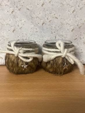 Glass Tealight Holder- Brown Fur 8cm - Pair